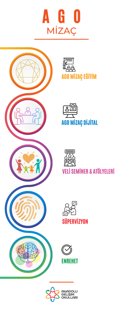 Tüm okul idarecilerine, öğretmenlerine ve rehber öğretmenlerine ‘’Temel AGO Mizaç Eğitimi’’ verilir. Bu eğitimlerle birlikte katılımcılar mizaç yapılarının temel arayış ve motivasyonlarına dair bilgiler alır, mizaçları yakından tanırlar. Mizaçların potansiyel yetkinliklerini, imkan ve kabiliyetlerini, risklerini keşfederler. Her mizaca özel yaklaşımlar ve gelişim önerileri konusunda mizaç merkezli bir bakış açısı kazanırlar.