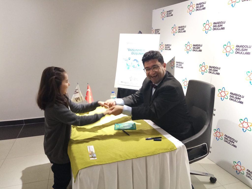 AGO’da keyifli söyleşiler devam ediyor! Serhan Kansu’nun katılımıyla gerçekleşen “Çocuklarla Felsefe” konulu söyleşi, minik okurların başarılı yazardan aldıkları imzalı kitaplarla tamamlandı.